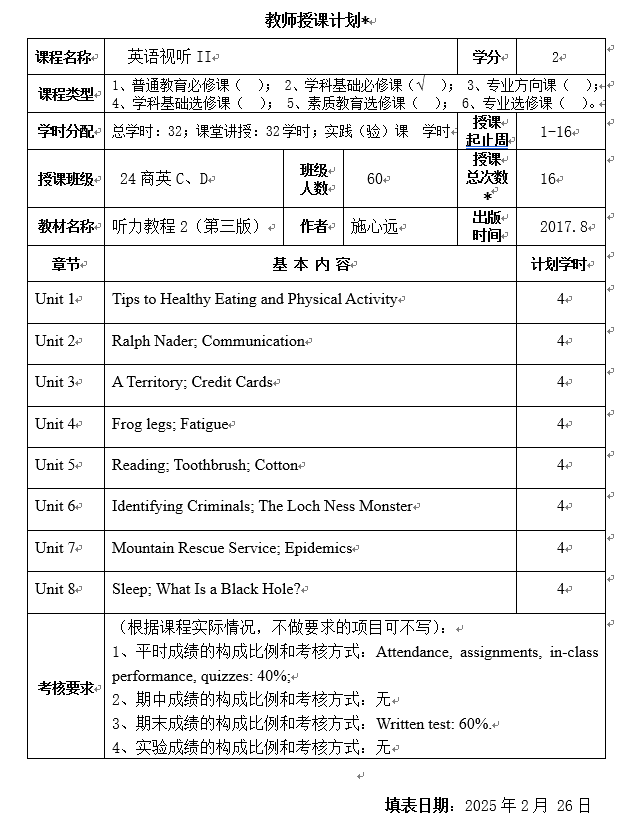 经过《英语听说II》课程教学的听力训练,学生在课程结束时应能达到下列要求: