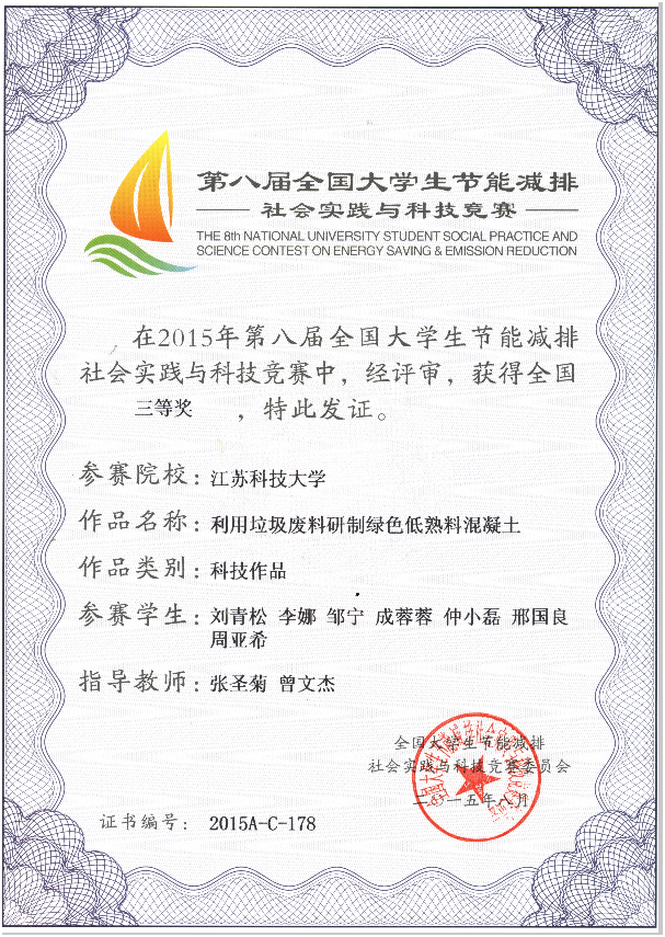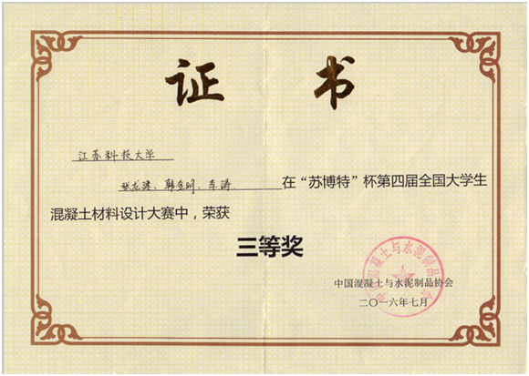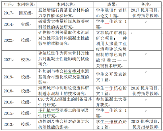(1)学科竞赛方面:团队教师积极指导本科生参加“苏博特杯”全国混凝土材料设计大赛、全国节能减排大赛、国际大学生混凝土龙舟赛、“挑战杯”江苏省大学生创业计划竞赛、“互联网+” 大学生创新创业大赛等与本课程相关的省部级以上学科竞赛并获奖多项。以下为课程负责人指导的与本课程相关的部分学科竞赛获奖情况。