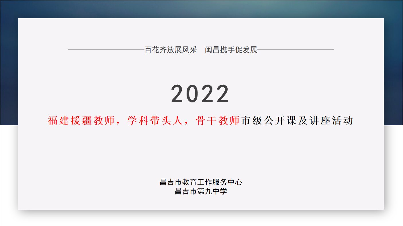为了进一步提高我市教师的业务能力和岗位素质,充分发挥福建援疆教师,学科带头人,骨干教师的示范引领作用,促进广大教师互学互鉴,推动构建以“深度学习”为特征的高效课堂,提高课堂教学质量,昌吉市教育工作服务中心教研室和昌吉市第九中学联合举办福建援疆教师及学科带头人、骨干教师公开课及讲座活动。