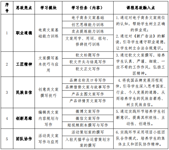 本课程以电子商务文案撰写理论为入口,以电商文案为设计对象,以 秀米等软件为主要设计工具,采用理论知识与实际案例相结合的方式介绍了电子商务文案撰写的具体设计思路和操作实现方法、步骤,通过具体案例的设计,围绕“展现自信创新共协作,电商赋能产业定振兴”为思政主线,将“职业道德”“工匠精神”“民族自信”“创新思维”“团队协作”等思政元素,不断的建设和丰富资源库。