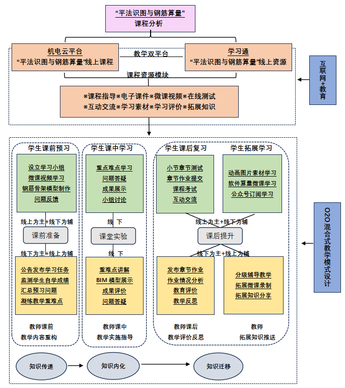 课程团队本着“教师为主导,学生为主体”的教学理念,在“互联网+”背景下实施O2O混合教学,从“线上—线下—线上、课前—课中—课后—拓展、知识传递—知识内化—知识迁移”的三个维度进行教学设计。包括校内课前准备、课堂实施、课后提升三个阶段,同时线上平台增设拓展学习模块,供企业员工、学有余力者继续教育学习。