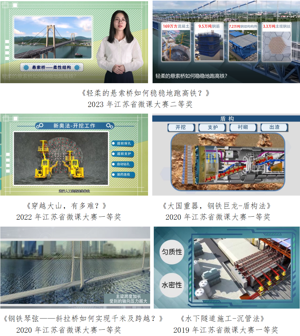 近年来,《高速铁路桥隧施工与维护》教学团队深化教学改革,2022年,参加江苏省职业院校技能大赛,获教师组省三等奖。多次参加江苏省高校微课教学比赛,获省一等奖省二等奖共5项。