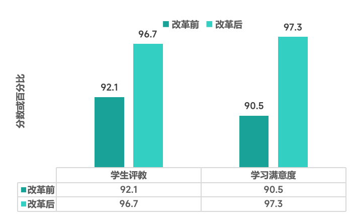 与往年相比,学生评教分数增长4.5分,达到96.7分,在学院42门课程中,学生评教排名第一;学生学习满意度上涨6.8%,达到97.3%,学生评价积极(见图7),说明学生对课程的高度认可。