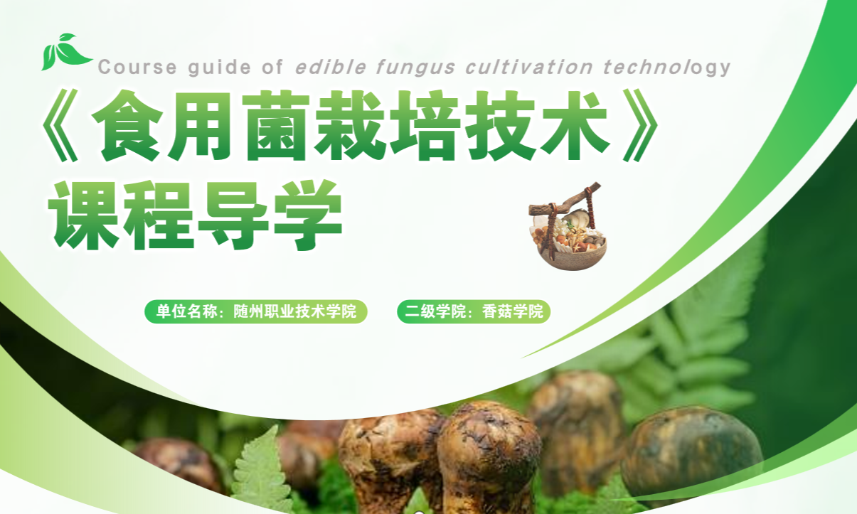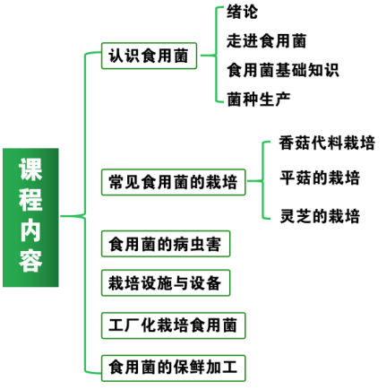 《食用菌栽培技术》课程属于食用菌生产与加工技术专业核心课程之一。通过本课程的学习,使学生掌握食用菌基础知识;香菇、平菇和灵芝这些常见食用菌的栽培;病虫害防治;工厂设施化栽培、产品加工以及产业园区规划等理论知识和实践技能,培养具有经营管理食用菌企业能力和具有创新创业精神的高技能实用型人才。 这门课会讲什么?