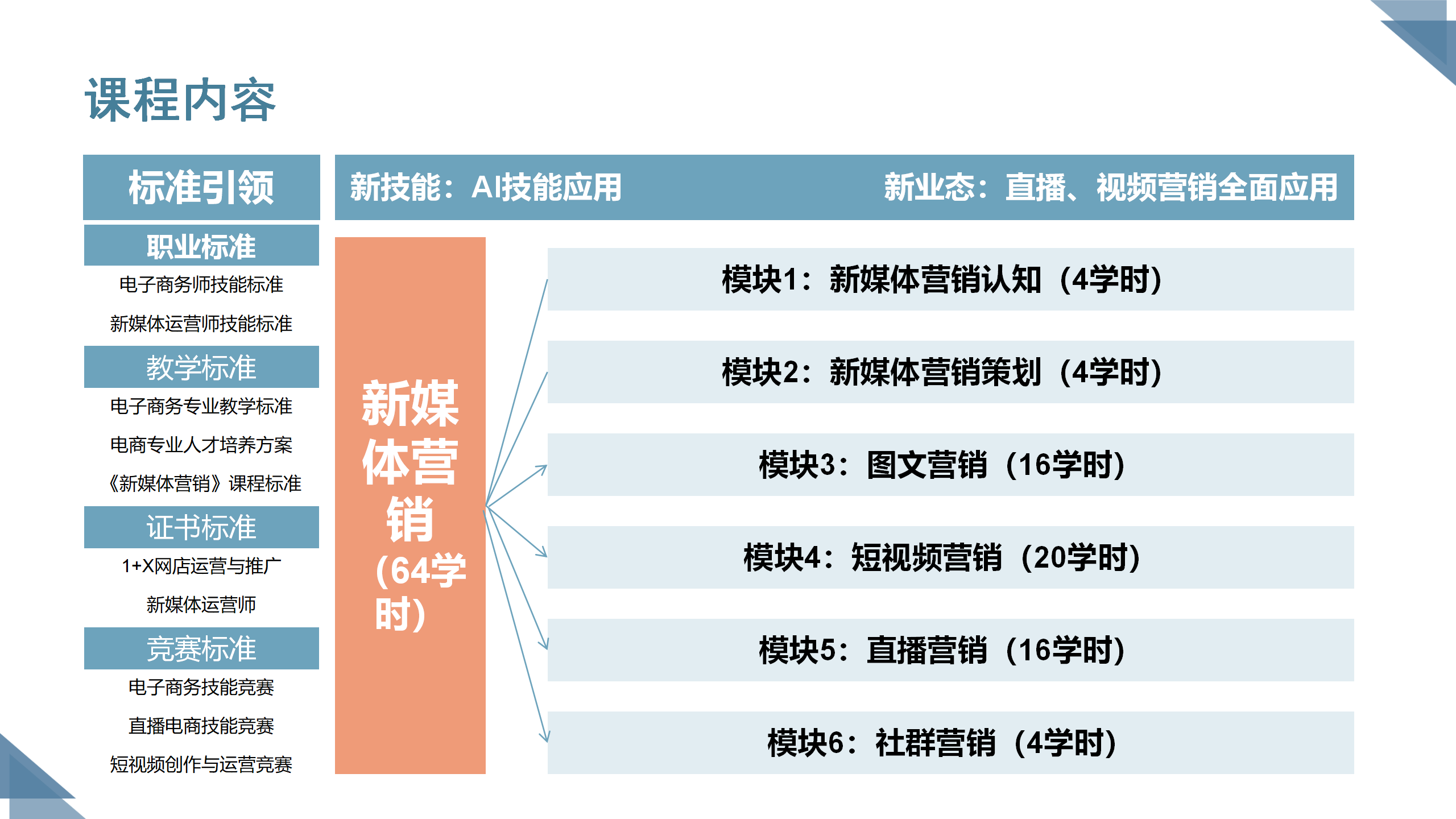 《新媒体营销》是一门建立在电子商务、市场营销基础上,依照企业工作流程,以新媒体为载体,以实践为中心的课程,具有系统性、实操性、针对性的特点。课程面向电子商务、商务数据专业大二学生开设,共16周64课时。整个课程内容是项目驱动的模块化教学,主要分为6个模块:新媒体营销认知、新媒体营销策划、图文营销、短视频营销、直播营销、社群营销。在6个模块相互支持的理论和技能基础上,融入课程思政,结合新媒体运营的工作要求,同步设计与其相配套的科学合理的实训内容体系,依托校企合作,综合提升学生的知识素养、技能素养和职业素养。