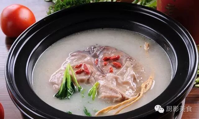 据民间传说,野猪在吞食毒蛇后,毒蛇的毒牙将咬住野猪肚内壁,而在长期各种中草药浸泡下的野猪肚,自有一套疗毒愈合伤口的高招,会在伤口基底生出肉芽组织,进而形成纤维组织和瘢痕组织在胃表面胃粘膜上留下一个“疔”,“疔”越多,药用价值就就相对越高。而且现代医学实验也表明野猪肚含有大量人体必需的氨基酸、维生素和微量元素,可助消化,促进新陈代谢,对胃出血、胃溃疡、胃炎、肠溃疡和胃下垂等有显著疗效。据说野猪肚是一种非常好的治疗胃病的药膳。野猪肚对胃出血、胃炎等有特殊疗效,如果加上红枣、西洋参、桂圆、杞子等配料用文火炖烂,治胃病相当灵验。这一道菜就是典型的药膳,以野猪肚为主料,辅以枸杞和山药,炖出的汤汁呈乳白色。