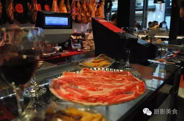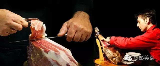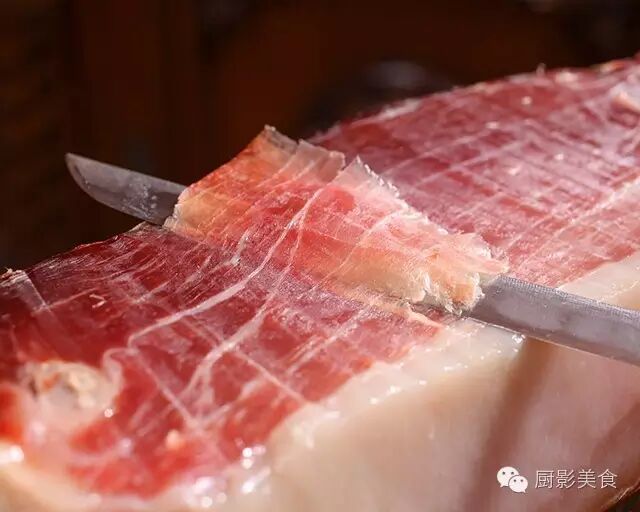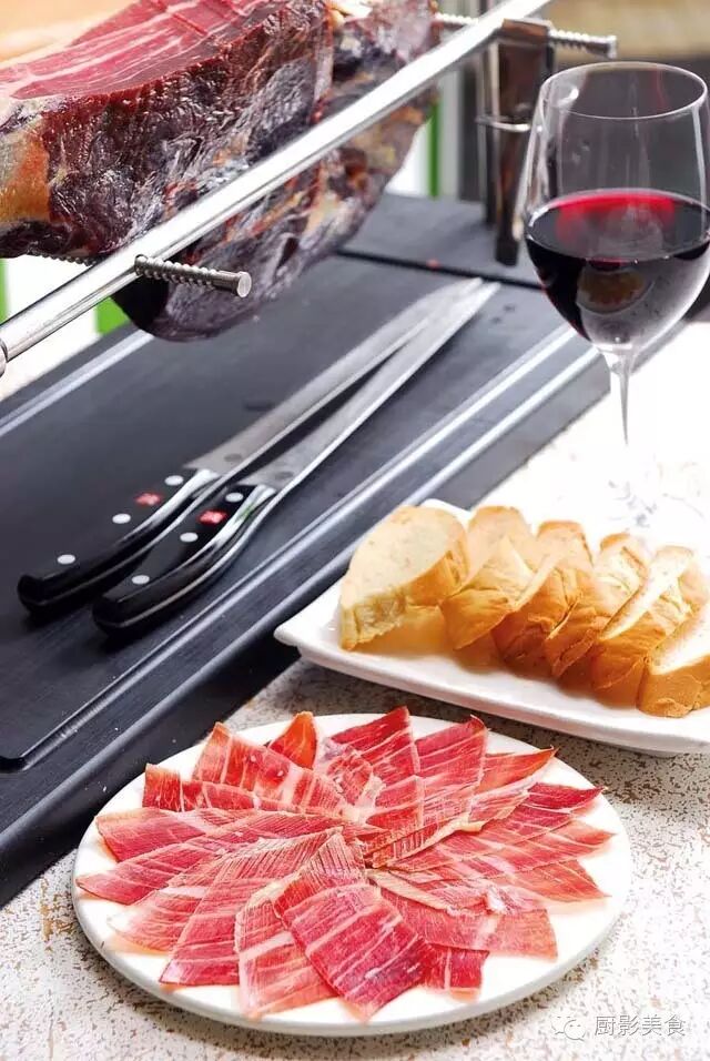 西班牙伊比利亚火腿的正确吃法就是切薄片生吃,现切现吃。亦或是火腿薄片配上一口红酒或雪利酒,是西班牙最典型的小酒馆味道。当然,也可以一片火腿配一块面包、饼干,这是南部安达卢西亚流行的吃法。