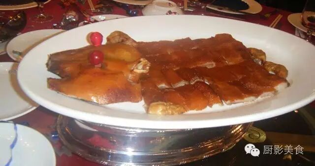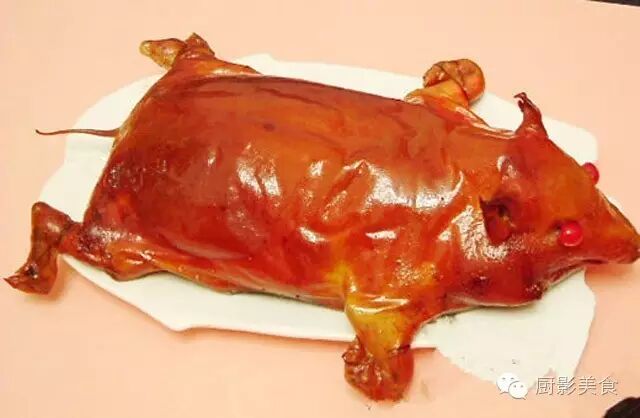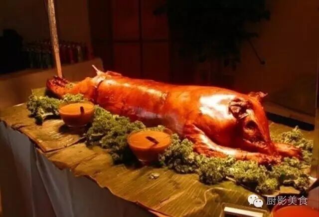 烤乳猪最好的是年纪比较小的猪,这种猪的皮比较嫩,油脂少。一般分为两次上席。第一次先吃最香酥的猪背皮,将猪皮片切成24件或36件,拼回原形上席,体现全猪的形美;第二次把剩下的其他部位的皮和肉切成小样,仍砌成猪形再上席。第一次上席要配白糖、千层饼;第二次上席则配酸菜、葱末。