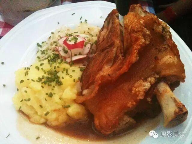 而在德国南部巴伐利亚地区则是运用烧烤的方式烤猪肘,外皮金黄色,外酥里嫩。