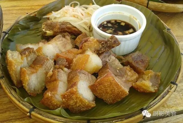 烤乳猪是菲律宾宴席上的主菜,当然也是马尼拉地区的美食之一,被当地人成为“勒琼”(Lechon),逢年过节的时候,当地人就会当作是餐桌上的美味佳肴。菲律宾的烤乳猪是用一整只猪来做的。先把猪剥好洗净,肚子里塞进香蕉叶、盐和其他香料或调味品,用一根大竹竿把“乳猪”从中心直着串起来,架在两个竹叉上,然后用椰子壳做燃料慢慢熏烤。烤的时候猪皮上刷上油,油里面加入了一种叫做atsuwete 的调料,这样猪皮就呈现出暗红色。“要是在野外的椰林中熏烤,随着袅袅的炊烟升起,肉香、香蕉香、椰子香混合着在椰林中飘荡,能让人心旷神怡,胃口大开。”