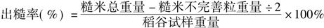 稻谷的出糙率是指一定数量稻谷全部脱壳后所得糙米质量(其中不完善粒折半计算)占稻谷总质量的百分率。出糙率的计算公式为: