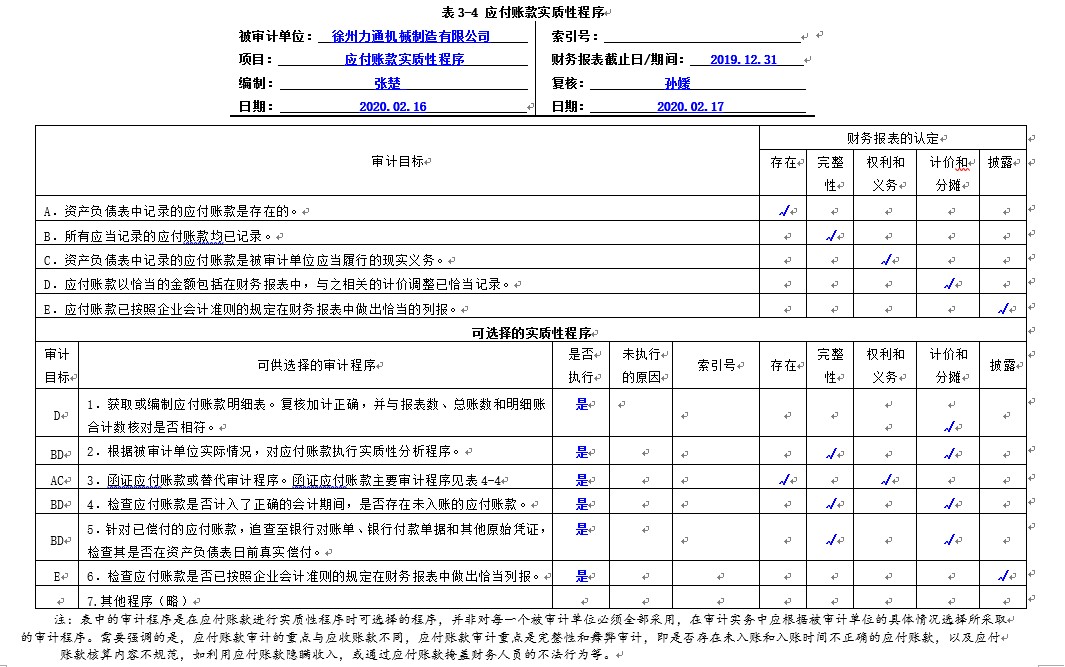 【背景资料】2020年2月15日,财缘会计师事务所的审计人员张楚、孙媛依据《中国注册会计师审计准则》和徐州力通机械制造有限公司2019年度财务报表审计的具体实施方案,负责应付账款的审计。两人实施了审阅、核对、函证等程序。取得的会计资料如表3-1、表3-2、表3-3所示。