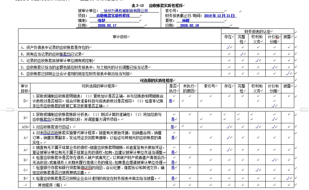 财缘会计师事务所接受委托于2020年2月17 日对徐州力通机械制造有限公司(以下简称力通公司)2019年度财务报表进行了审计,注册会计师张楚、孙媛负责应收账款的审计。主要实施了审阅、核对、函证等程序。