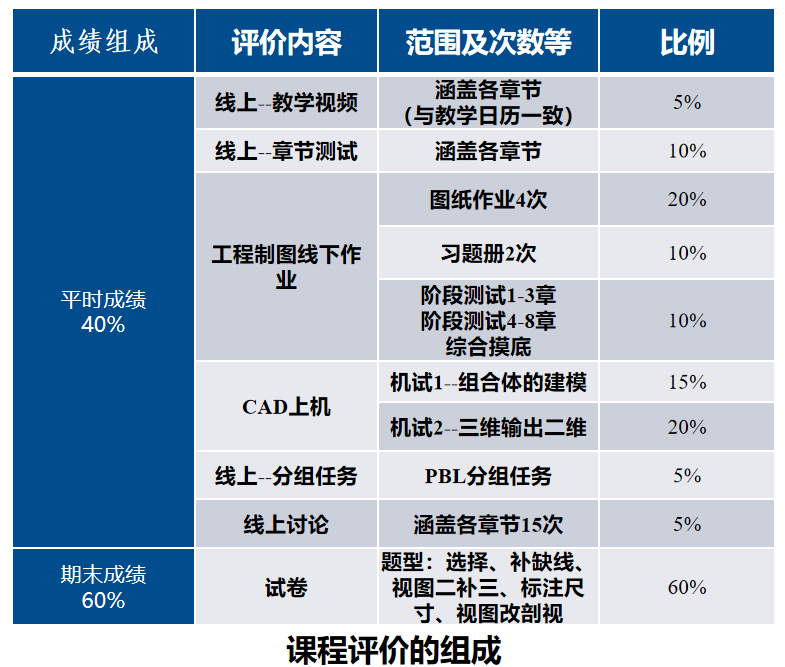 授课对象:电子信息、电缆工程等专业的大一学生。 课程性质:学科基础必修课程。 学时分配:工程制图40学时,CAD8学时。 通过本课程的学习,使学生掌握利用尺规和计算机绘制工程图样的能力,同时为学习后续课程夯实专业基础。通过该课程的学习,为培养综合素质高的工程科技应用型人才助力。 课程目标:正确使用绘图仪器,掌握尺规绘图技巧;理解和应用正投影原理阅读和绘制中等复杂程度的零件图;根据组合体种类,区辩读图方法的应用场合;能够根据视图创新构型出多个形体;能够根据零件结构特点,选用合适的表达方案;熟练操作SOLIDWORKS并领会建模技巧,采用便捷的建模顺序;形成遵守国家标准的意识;养成认真负责的工作态度和严谨细致的工作作风。