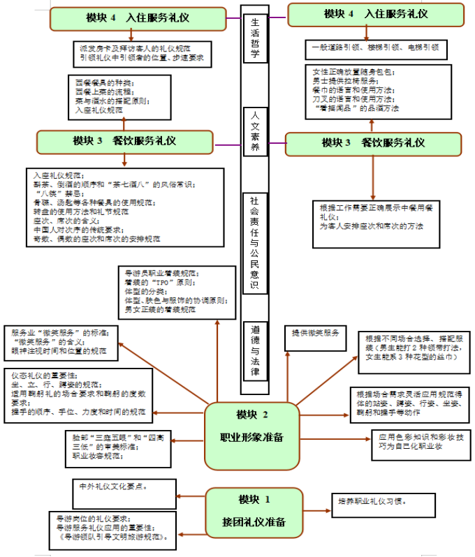 服务礼仪(原旅游服务礼仪)是旅游管理专业的专业基础课程。本课程把“德挥动于内,礼发诸外”这一思想贯穿于整个教学环节中,从而使学生对“礼仪”的内涵有了更深刻的认识。“德”是礼的灵魂,培养学生做一个品德高尚的人;“敬”是礼的核心,培养学生树立严肃恭敬的人生态度,敬己、敬人、敬业。通过讲授、角色扮演、案例教学、现场模拟教学等多种教学方法的运用,使学生自身修养,个人形象,综合素质都能够得到提高;使学生进入企业后能够增进交往,改善人际关系,塑造旅游企业形象;使学生能够成为中华优秀礼仪文化的弘扬者、保护者,为和谐社会的创建做出贡献。因此,学好这门课程,将使学生的一生都受益匪浅。