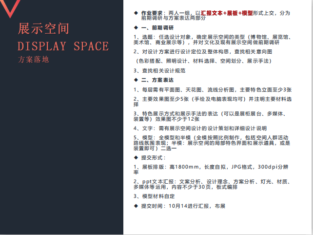 教学要求:要求学生对展示空间设计的基本概念、范畴有全面的了解和认知,了解展示设计的前期工作和展示的总体设计流程,掌握展示设计形式法则、人机工程学的应用法则,以及与其相关联的展示环境的空间、照明、色彩等,并能够结合实际案例进行实践操作训练,完成系统性的展示空间设计。