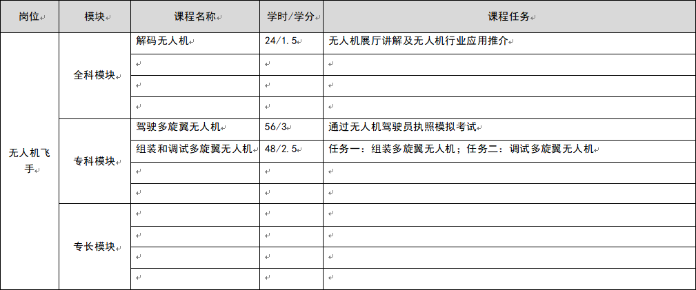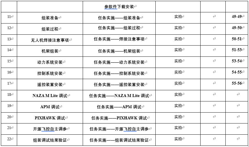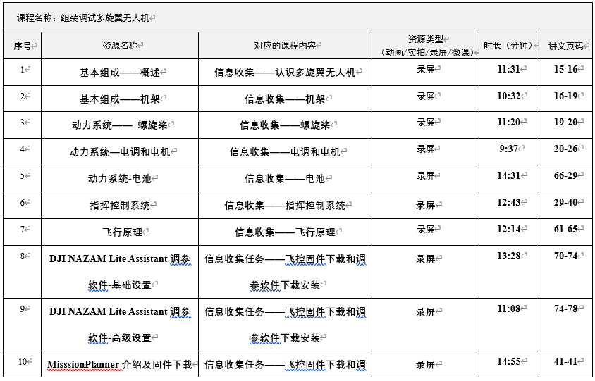 《组装和调试多旋翼无人机》课程是本专业开设的专科模块课程。在本课程中要求学生了解多旋翼无人机,认识常见的几种多旋翼无人机;熟悉多旋翼无人机的基本飞行原理;熟悉多旋翼无人机的主要部件和组成;掌握F450多旋翼无人机的组装和调试,并学会F450多旋翼无人机的基本飞行操作。 通过本课程的学习,要求了解多旋翼无人机和固定翼无人机的区别和不同,了解多旋翼无人机和固定翼无人机的飞行原理上的区别。认识常见的几种多旋翼无人机,熟悉多旋翼无人机的主要部件和组成;从F450多旋翼无人机的主要部件选择开始,培养学生组装和调试多旋翼无人机的能力,为下一步多旋翼无人机飞行训练以及解决飞行过程中出现的问题打下坚实的基础。