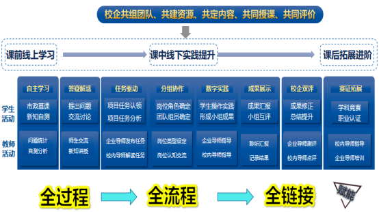 教学方法上我们采取校企共组团队、共建资源、共定内容、共同授课、共同评价的模式;教学过程上我们按照课前线上学习、课中实践提升、课后赛证拓展三段式教学来设计学生以及教师活动。整个教学过程按照线上自主学习、线下答疑解惑、任务驱动、分组协作、展数字实践、成果展示、小组互评、校企双评、赛证拓展来开展,从全过程全流程全链接跟踪学生学习轨迹。