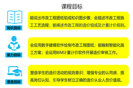 1.知识目标:能说出市政工程图纸的组成和识图步骤;会描述市政工程的施工工艺流程;能阐述市政工程的造价组成及计价规则。