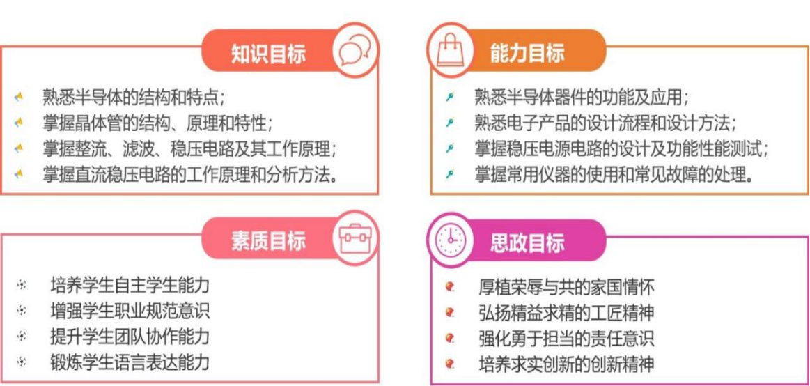 预习内容 | 加入班级学习通,课前自主学习课程在线资源: https://mooc1-1.chaoxing.com/course/207472514.html 1.稳压电源设计方案(第1次课2课时) 2.整流电路的设计(第2次课4课时) 3.滤波电路的设计(第3次课2课时) 4.稳压电路的设计-电路结构与工作原理(第4次课2课时) 5.稳压电路的设计-电路参数计算与设计(第5次课2课时) 6.稳压电路的设计与仿真(第6次课4课时) | ||||