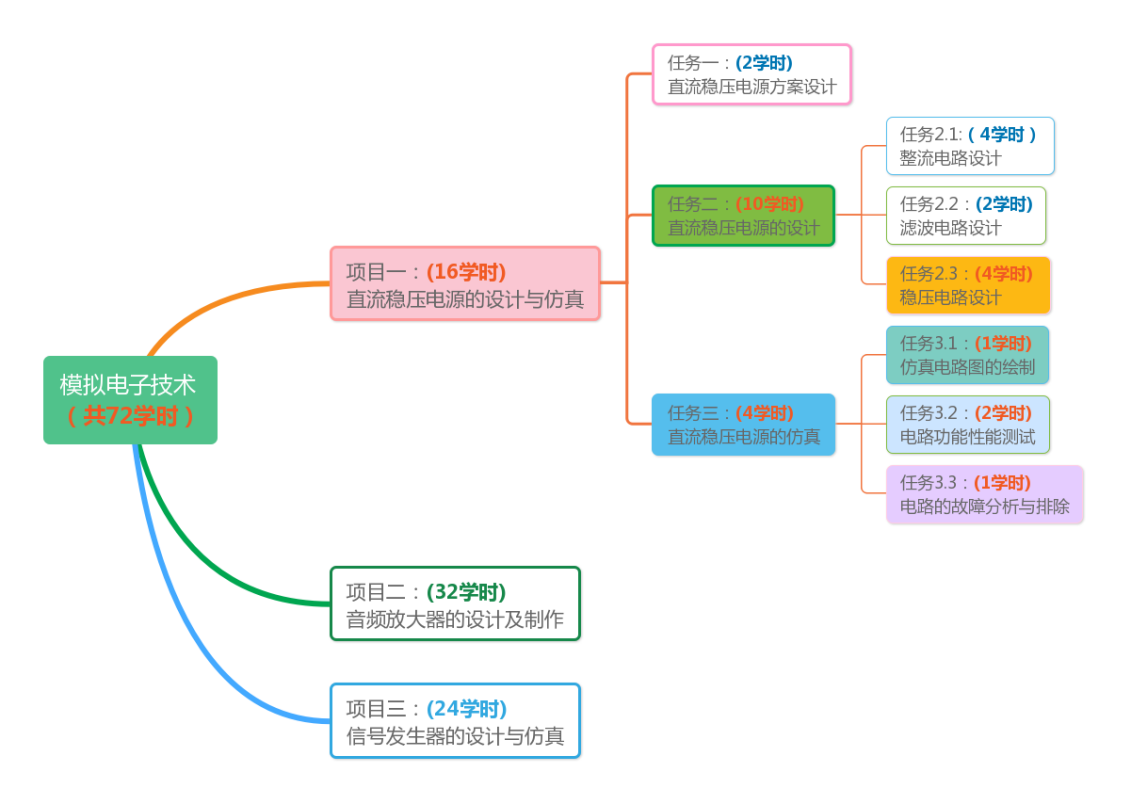 《模拟电子技术》课程是电子类专业的专业基础课程,主要培养学生具备电子产品设计开发、电子信息系统集成等岗位所需的模拟单元电路的分析、设计、测试与制作调试能力。本课程拟通过“直流稳压电源的设计与仿真”、“音频放大器的制作与调试”、“信号发生器的设计与仿真”等三个案例的学习与实践。课程内容主要涉及的理论知识点主要是半导体器件、基本放大电路、功率放大电路、差分放大电路、运算放大电路、反馈放大电路、信号产生及信号变换电路、电源电路等。案例涉及的实践操作主要是模块电路的设计仿真、电路的焊接组装、电路的测调、仪器仪表工具的使用等。