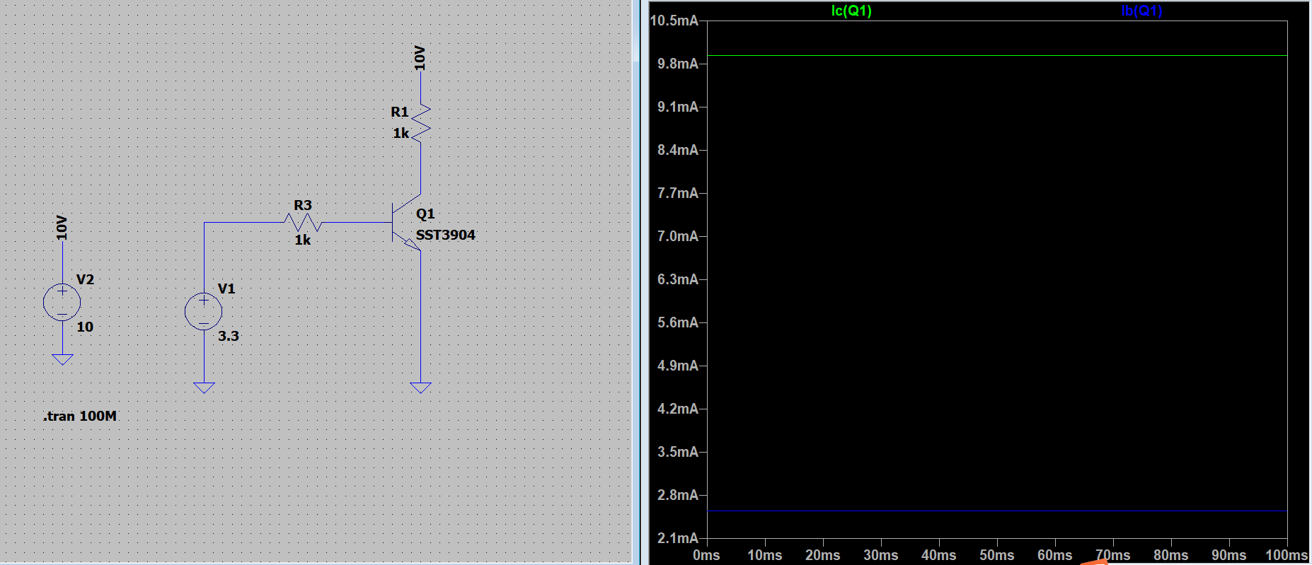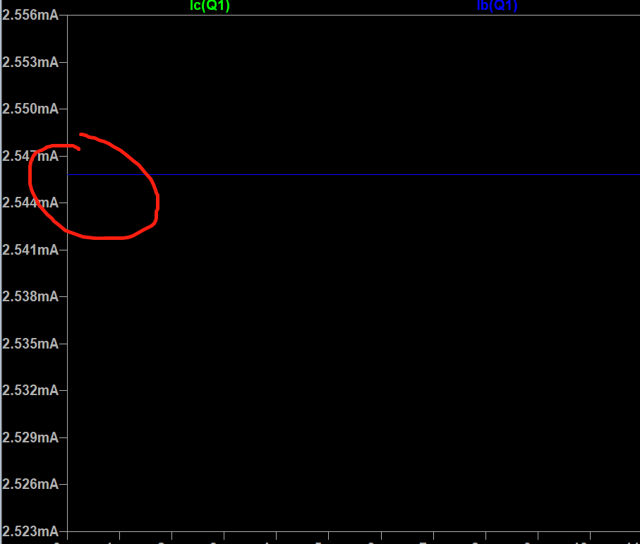 上述图 1 电路在理想情况下的基极电流是(3.3-0.7)V/1k=2.6mA,可以看到仿真值为2.54mA,基本一致。远远大于三极管处于饱和状态需要的最小理论基级电流值50uA,因此,此电路中的三极管处于饱和状态。