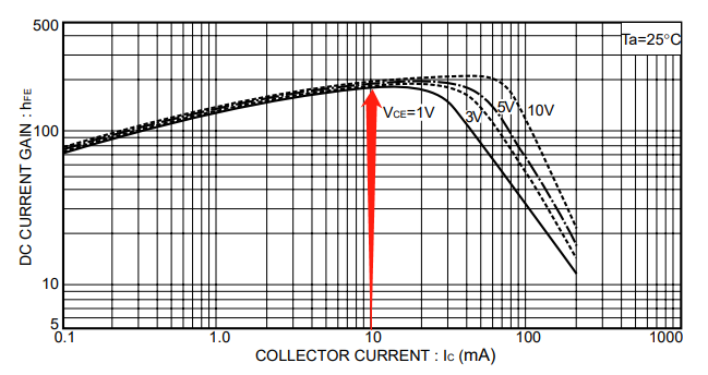 通过查看三极管SST3904的芯片手册我们知道,三极管在集电极电流为10mA时的放大倍数为200左右,假设放大倍数200,则此时三极管工作在集电极的饱和区的最小基极电流为Ib=10mA/200=0.05mA=50uA