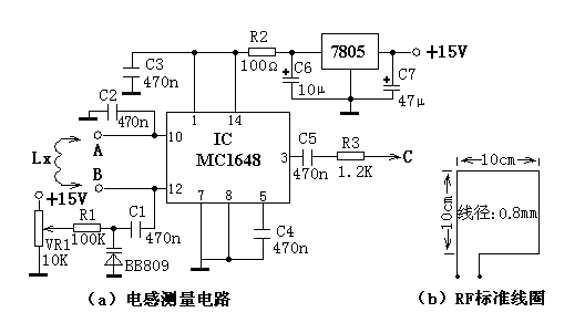 BB809 是变容二极管,图中电位器 VR1 对+15V 进行分压,调节该电位器可获得不同的电压输出,该电压通过 R1 加到变容二极管 BB809 上可获得不同的电容量。测量被测电感LX 时,只需将 Lx 接到图中 A、B 两点中,然后调节电位器 VR1 使电路谐振,在 MC1648的 3 脚会输出一定频率的振荡信号,用频率计测量 C 点的频率值,就可通过计算得出 Lx值。