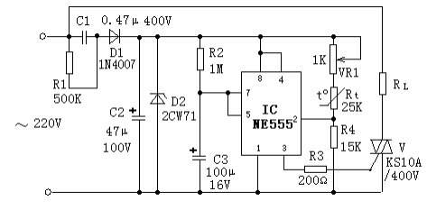 当温度较低时,负温度系数的热敏电阻 Rt 阻值较大,555 时基集成电路(IC)的 2 脚电位低于 Ec 电压的 1/3(约 4V),IC 的 3 脚输出高电平,触发双向晶闸管 V 导通,接通电加热器 RL 进行加热,从而开始计时循环。当置于测温点的热敏电阻 Rt 温度高于设定值而计时循环还未完成时,加热器 RL 在定时周期结束后就被切断。当热敏电阻 Rt 温度降低至设定值以下时,会再次触发双向晶闸管 V 导通,接通电加热器 RL 进行加热。这样就可达到温度自动控制的目的。