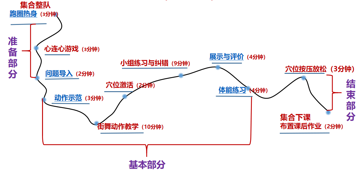 根据学生无基础、表现力不够的基本学情,热身采用时尚热身舞或学生依据专业特点创编游戏,热身舞如螃蟹舞、黑桃A,小苹果等等,游戏如爱心接力,金山银山等等,让学生跟着潮流健身舞进行热身,激发上课活力;教学内容采用自编街舞套路动作以适应学生学习能力,让学生能够学会并以小组形式进行展示;体能练习部分采用运动健身app进行趣味练习,如切水果、贪吃蛇和跳神、腹肌等专项体能练习,能够即时的反馈练习数据以进行身体素质分析,更好的科学健身指导;放松部分采用穴位按压和非物质文化遗产五禽戏内容,既让学生能够了解非物质文化遗产,又能学会更好的采用穴位按压放松肌肉,激发学生运动兴趣,打造高阶创新课堂。| 课程章节 | | 文件类型 | | 修改时间 | | 大小 | | 备注 | |