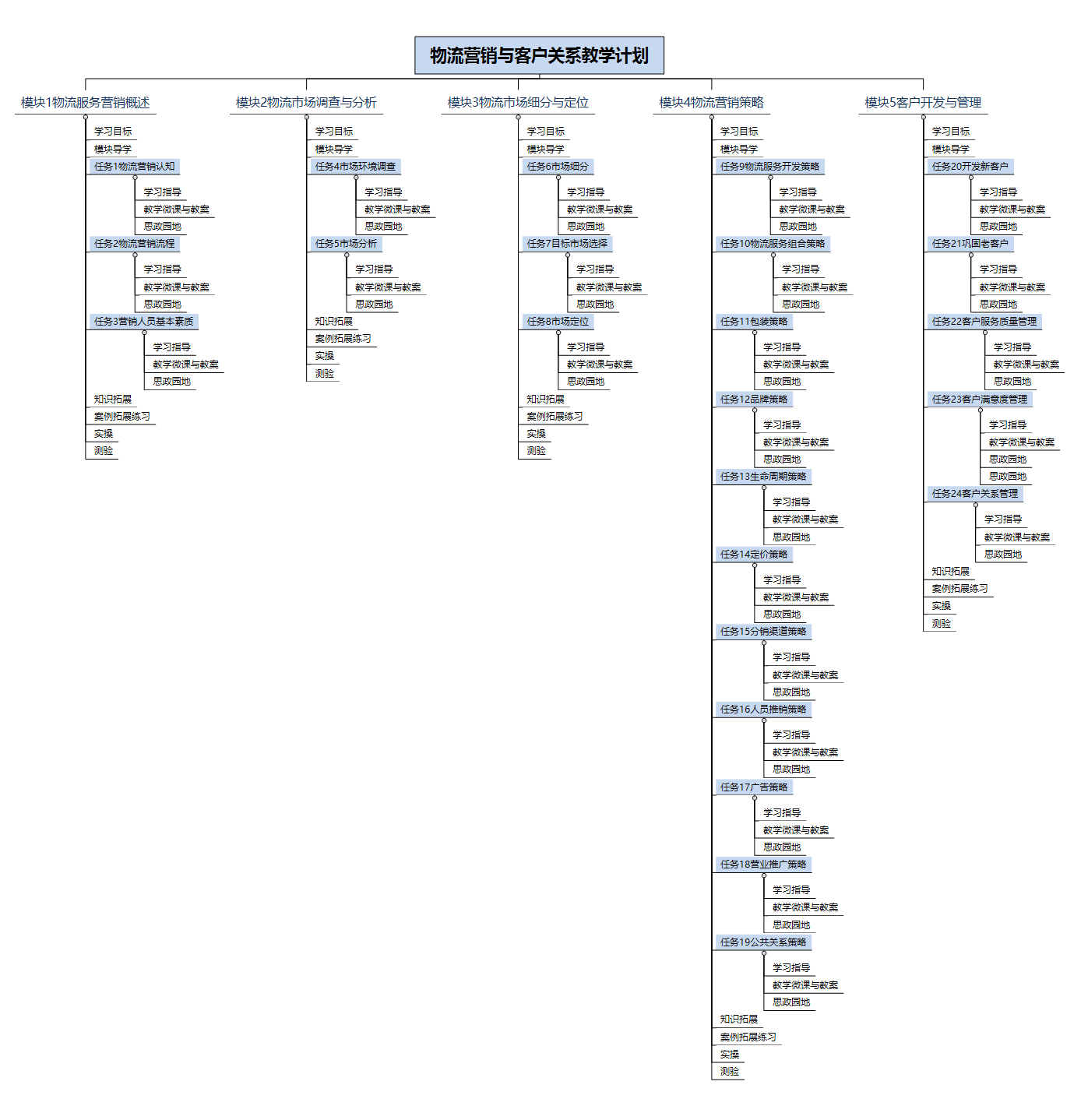 本课程设计为五个教学模块:物流服务营销概述、物流市场调查与分析、物流市场细分与定位、物流营销策略、客户开发与管理。通过课前“练”暴露问题、课中“学”解决问题、课后“思”优化方案与“拓”丰富应用的“练学思拓”能力训练模式。在理实一体化环境中由教师主导、学生主体、互动参与共同完成项目。| 课程章节 | | 文件类型 | | 修改时间 | | 大小 | | 备注 | |