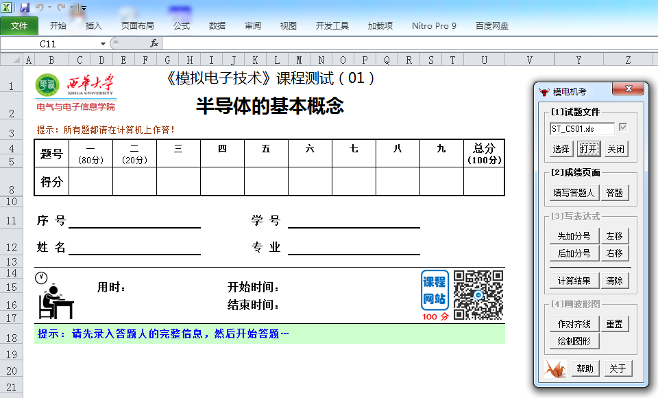 ● 答题操作说明 1)启动面板:对于模电的测试或习题,进入相应文件夹后,执行“模电机考.exe”文件便可。 2)打开试题:检查面板上的试题文件名,无误后单击“打开”按钮,系统打开试题文件,首先看到的“成绩”页面。 3)填答信息:先在序号栏输入自己的序号,然后单击控制面板上的“填写答题人”按钮。 4)开始答题:核对自己的信息无误后,单击控制面板上的“答题”按钮进入试题页面。 5)进行答题:按要求答题,每道大题都对应一个页面,单击页面标签进行切换。 6)结束答题:完成答题后,返回“成绩”页面,单击控制面板上的“结束”按钮。 7)提交批改:单击控制面板上的“提交”按钮,系统批改答题,完成后给出相关提示。 8)关闭系统:单击控制面板窗口右上角的“关闭”按钮,关闭控制面板和Excel软件。 9)上传文件:将批改后的数据文件上传到任务贴指定的位置(数据中心服务器对应文件夹)。 |