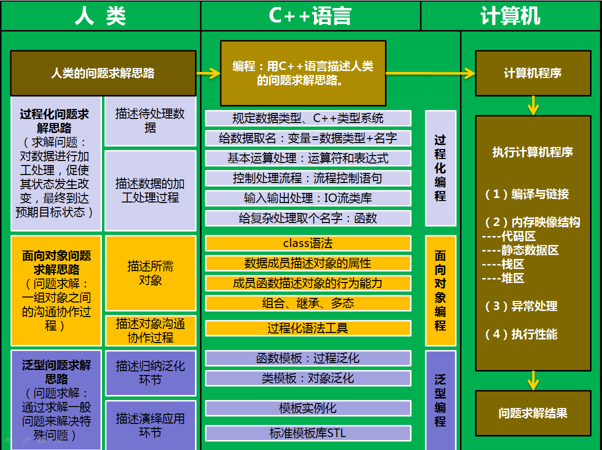 1. 学习目标:学习使用C++语言将人类的问题求解思路描述出来,形成计算机程序,然后在计算机的帮助下实现问题求解。 (1)什么是程序:把人类的问题求解思路用计算机语言描述出来,就是程序(program)。 (2)什么是编程:用计算机语言描述人类的问题求解思路的过程,就是编程(programming) (3)什么是求解问题:计算机按照程序指令按部就班地工作,得到计算结果就是求解问题。 (4)计算机语言:能够被计算机直接或间接理解和执行的、用于描述人类的问题求解思路的语言工具。 (5)C++语言:是一种计算机语言,能够被计算机理解和执行,且便于描述人类的问题求解思路。 2. 学习C++语言主要学什么 (1)学习如何针对问题建立问题求解思路,核心是自顶向下逐步求精的分治思维(俗称计算思维)。 (2)学习如何使用C++语言表达我们建立的问题求解思路,即C++语言编程。