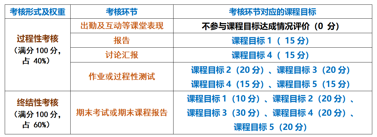 1、教学方式 本课程由线上课堂与线下课堂组成线上线下混合式教学方式,线上教学(30%)或由课程教师具体安排并组织实施。 ①、线上课堂为超星在线教学平台,所有授课内容都以知识点微视频、录播或ppt等形式呈现,学生可根据需求反复自由观看。每个单元都有相关的测验及线上讨论等辅助学习评价模块。 ②、线下课堂要求学生来到教室,与老师和同学进行面对面的交流学习和探讨。学生带着问题和思考来到课堂,提出问题师生共同解决,表达思想相互交流学习。老师根据教学计划,对相关单元内容进行教学设计,以便学生更好地理解、运用、深化、拓展线上课堂内容。同时,组织指导学生进行相关内容专题讨论、报告、练习、测验等。 2、考核原则与方式 (1)考核原则: ① 注重学生的学习过程考核,考核项目包括平时的课堂学习表现,课堂提问与讨论、学生作业、平时随堂小测验与阶段性测验、专题报告讨论等教学活动中的参与度。 ② 考核中体现对学生素质的培养,注重学生的工程知识学习能力、所学知识的综合运用能力、分析解决工程问题的实际应用能力、创新思维等。 ③ 线上与线下教学采用综合考核评价。 (2)考核方式及评价: 考核方式:课上课下和线上线下相结合的综合评定考核 ① 形成性过程考核:线上、线下综合考核评分。 考核范围开放:课上课下与线上线下考核相结合,理论与实际效果相结合的综合评定考核; 考核方式开放:小组考核、课外专题作业、作业质量、随堂与阶段性测验等表现相结合; 考核主体开放:分组专题讨论或辩论环节,学生自我评价、相互评价与教师评价相结合的方式,成绩直接计入总评成绩。 ② 终结性考核:以期末考试为主,实行闭卷考试。 3、考核及成绩评定方式