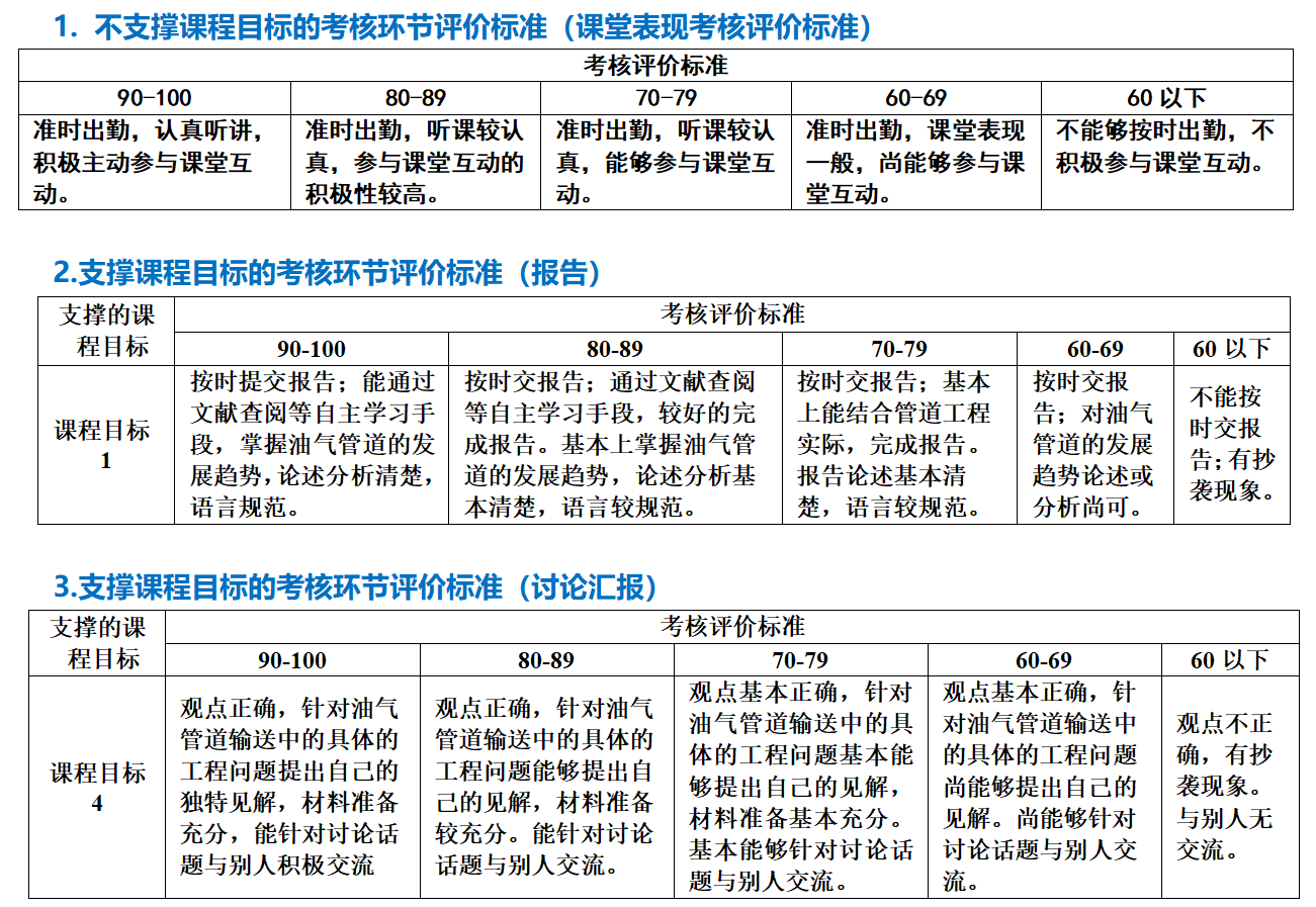 2 | 管道勘查设计概述 | 输油管道建设程序、设计阶段的主要内容 | 了解管道设计选线原则、勘察程序和要求、设计不同阶段要求 | 培养学生自学能力 | 课程目标5 |
