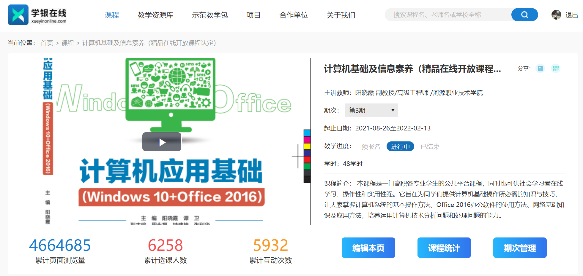 本课程是一门高职各专业学生的公共平台课程,同时也可供社会学习者在线学习,操作性和实用性强。它旨在为同学们提供计算机基础操作所必需的知识与技巧,让大家掌握计算机系统的基本操作方法、Office 2016办公软件的使用方法、网络基础知识及应用方法,培养运用计算机技术分析问题和处理问题的能力。
