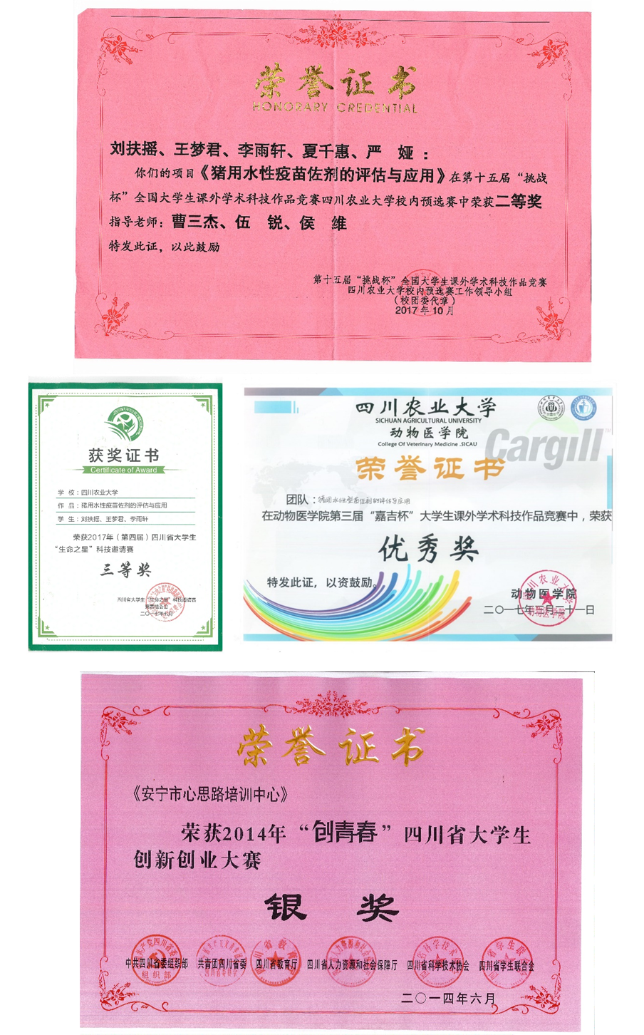 [2] 第十五届“挑战杯”全国大学生课外学术科技作品竞赛四川农业大学校内预选赛二等奖,2017年