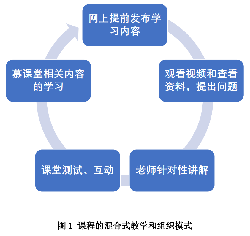 本课程为线下线上混合式教学方式示范课。课程建立了慕课堂、QQ微信群、学习小组等学习平台,课程实施首先由教师根据学习内容与进度,通过慕课堂、QQ群等在线工具发布学习内容与问题问卷调查,引导小组成员做好线上内容学习和问题讨论整理。课堂教学时,老师根据课程的重难点和学生的汇总问题,针对性进行课堂教学。课后,组织学生做好在线课程的讨论互动,各学习小组在慕课讨论区,上传整理重点学习问题并发起主题讨论,小组人员进行回复回答,由教师进行点评并确认正确的答案。在混合式教学中,所有教学内容与学生学习情况教师都可及时查看,并能进行实时在线交流,实现高效教学,课程的教学和组织方式见图1。