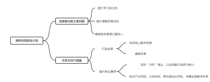 课程组将按照课程持续建设计划,明确改革方向,解决存在的主要问题,提升学生学习自主性、提升课程改革成效,注重课程思政元素和美育元素的渗入,不断总结教学改革经验,进而打造金课,提升学生职业素养。