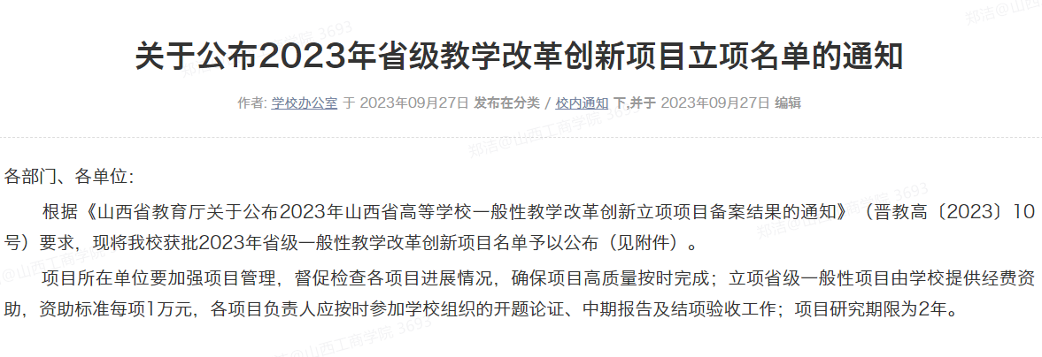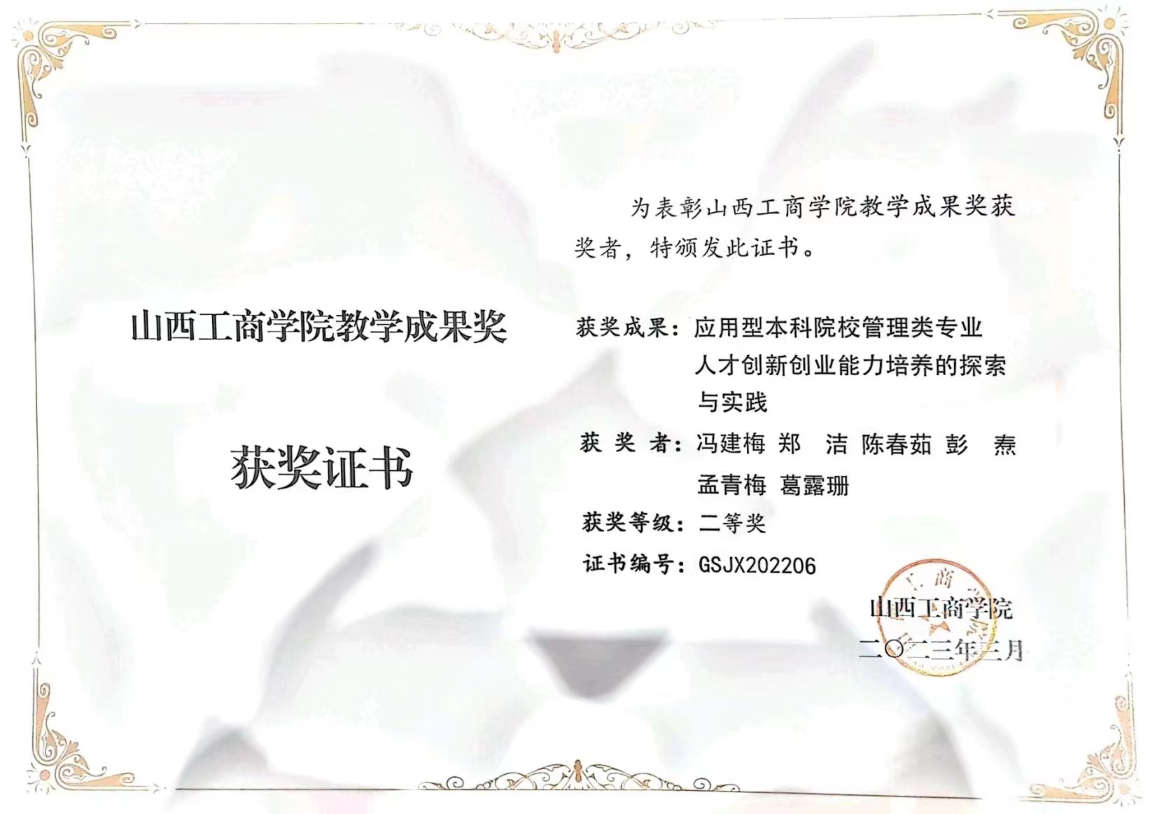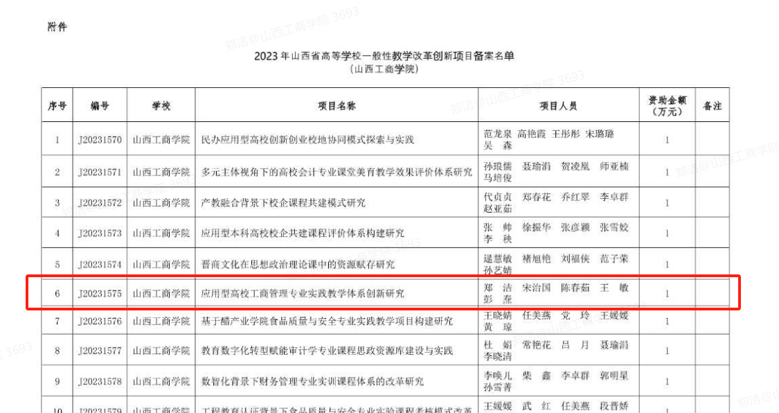 (5)参与山西工商学院2023年校级教学成果奖:《应用型本科院校管理类专业人才创新创业能力培养的探索与实践》二等奖;