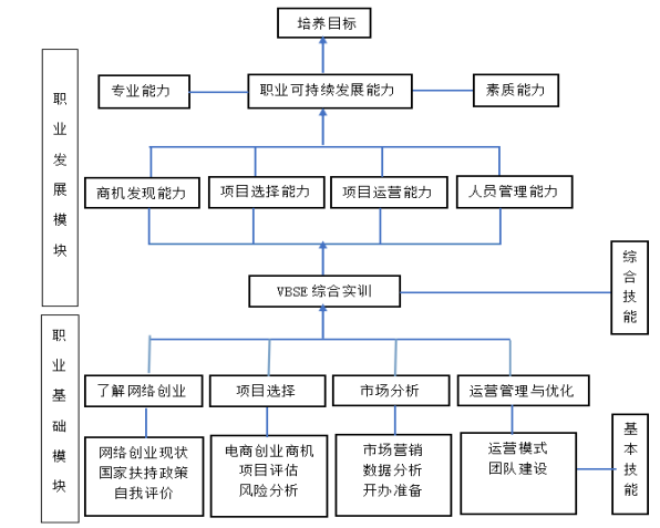 课程教学内容主要包括了解网络创业形势、项目选择、市场分析、运营管理与优化四大实训模块,网络创业的工作环节融入到实训课程当中,将理论和实践有效结合,具体安排如下图所示: