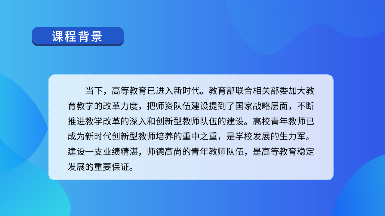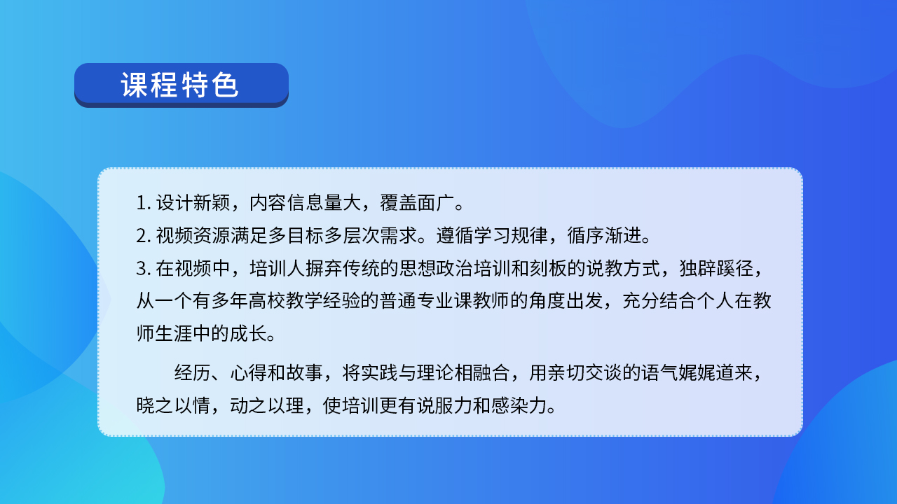 当前高校教师培训的内容比较单一,培训的基本内容主要是教育教学理论、教师技能培训、名师专家、师德讲座、教学实践课等方面的理论知识内容。本课程以高校青年教师教学技能提升与师德师风综合能力素质培养为主旨,围绕教学理念、师德师风、教学设计与方法、教师职业生涯规划等多方面进行分析和研究,录制了26个视频,360分钟的师资培训资料。作为青年教师线上线下学习的学习资料,达到师资培训的目的,以期实现高校青年教师教学技能的提升与整体师资水平的提高。