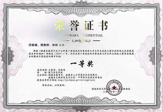 2024年在福建省第一届职业技能大赛互联网营销项目比赛中获优胜奖(第7名);