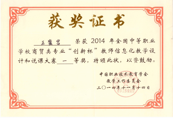 2014年参加全国信息化教学设计和说课大赛获一等奖;