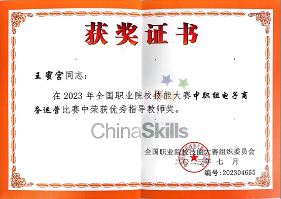 2023年指导学生参加全国职业院校技能大赛电子商务运营赛项获一等奖;并获“优秀指导教师”称号;