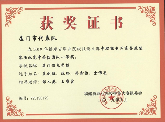 2019年指导学生参加福建省职业院校技能大赛电子商务技能赛项获一等奖;并获“优秀指导教师”称号;