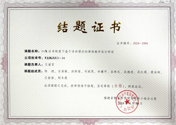 主持福建省“十四五”规划2021年度课题“1+X证书制度下基于活动理论的课程教学设计研究”,已于2024年结题;