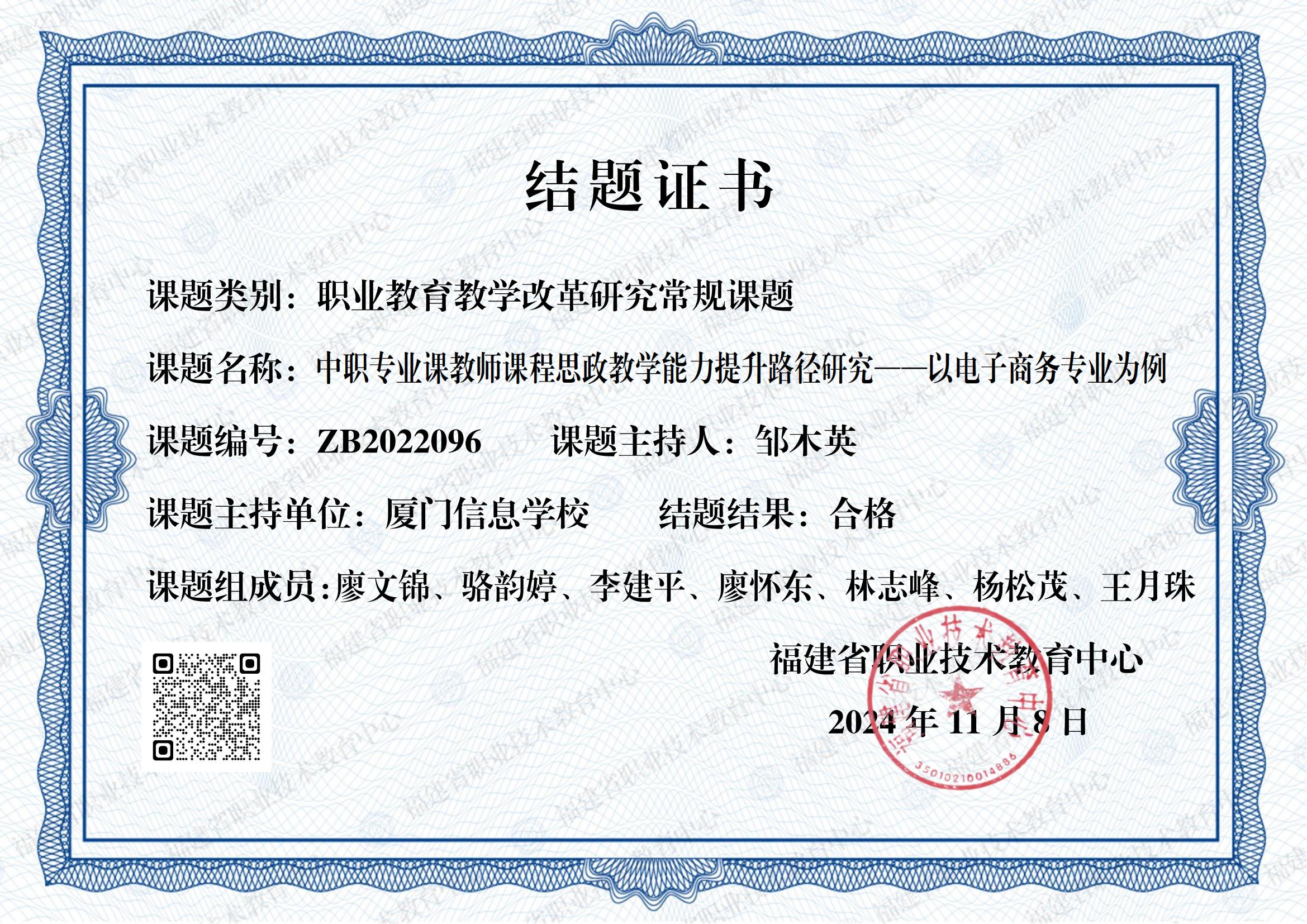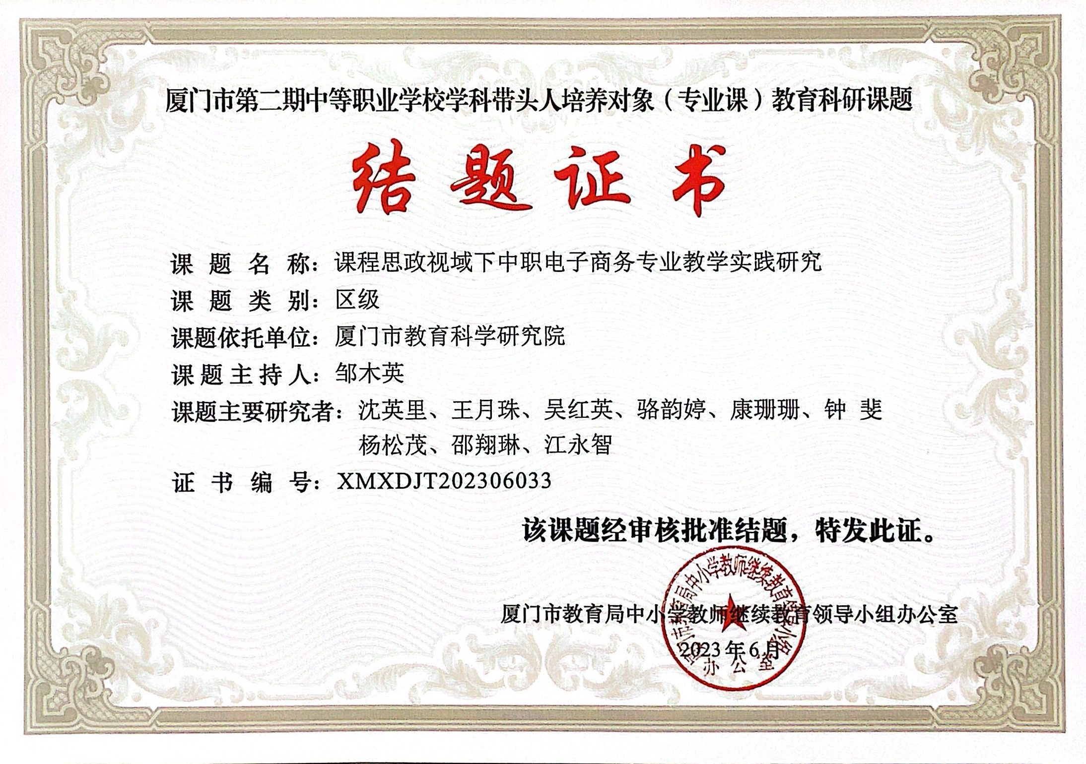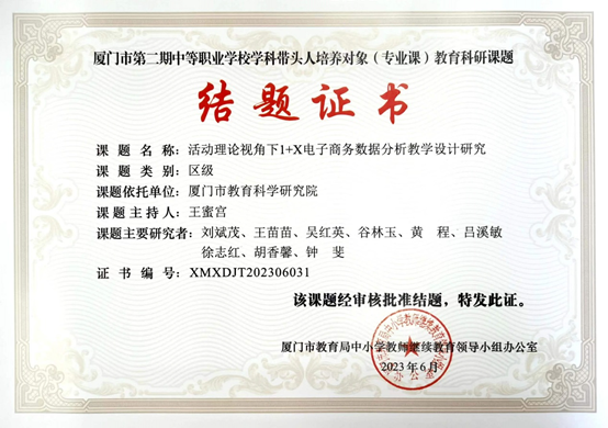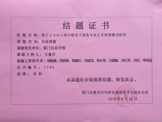 主持厦门市“十三五”规划2017年度课题“基于2.5+0.5的中职电子商务专业人才培养模式研究”,已于2019年结题;