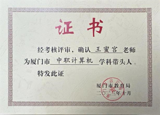 高级讲师,硕士研究生,厦门市高层次C类人才,厦门市计算机专业学科带头人,厦门市专家型教师培养对象,电子商务师一级/高级技师,双师型教师;