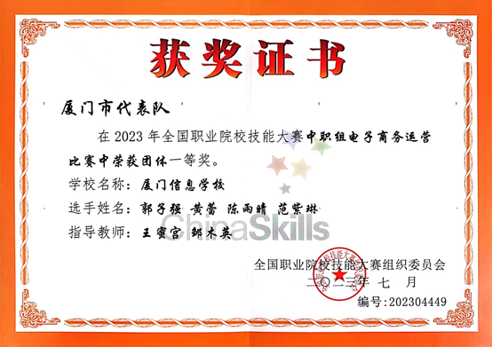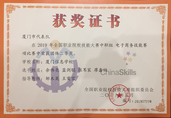 2024年在第三届厦门市职业技能竞赛中,荣获互联网营销师项目优胜奖(第4名);